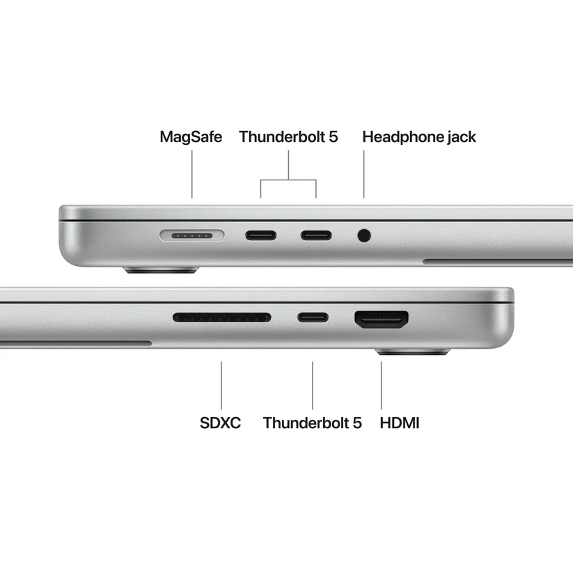 Разширителен порт3 Thunderbolt 4 (USB-C) ports with support for: Charging, DisplayPort, Thunderbolt 5 (up to 120Gb/s), USB 4 (up to 120Gb/s); MagSafe 3 port