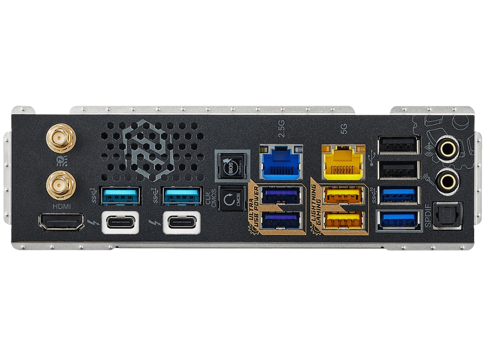 Интерфейс2 Antenna Ports, HDMI, Optical SPDIF Out Port, 2 Thunderbolt 4 Type-C, 4 USB 3.2 Gen2 Type-A, 4 USB 3.2 Gen1, 2 USB 2.0 Ports, 2 RJ-45, Clear CMOS Button, BIOS Flashback Button, Line Out Jack, Microphone Input Jack