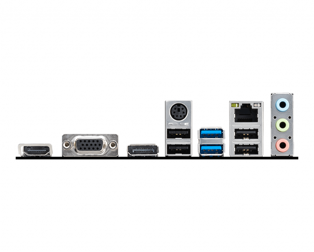 I/OHDMI; VGA; DisplayPort; Keyboard/Mouse; USB 3.2 Gen 1 5Gbps Type-A; LAN port; Audio connector; USB 2.0